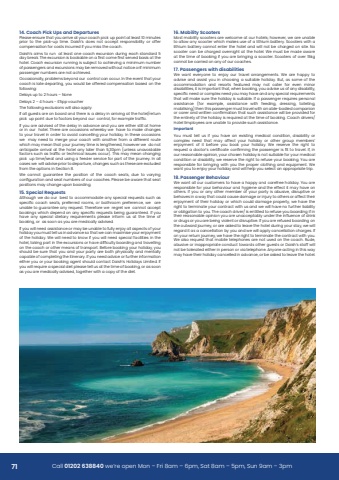 14. Coach Pick Ups and DeparturesPlease ensure that you arrive at your coach pick up point at least 10 minutes %u02e3%u02e5%u02dc%u02e2%u02e5%u0003 %u02e7%u02e2%u0003 %u02e7%u02db%u02d8%u0003 %u02e3%u02dc%u02d6%u02de%u02a0%u02e8%u02e3%u0003 %u02e7%u02dc%u02e0%u02d8%u02a1%u0003 %u02b7%u02d4%u02dc%u02e6%u02db%u03e0%u02e6%u0003 %u02d7%u02e2%u02d8%u02e6%u0003 %u02e1%u02e2%u02e7%u0003 %u02d4%u02d6%u02d6%u02d8%u02e3%u02e7%u0003 %u02e5%u02d8%u02e6%u02e3%u02e2%u02e1%u02e6%u02dc%u02d5%u02dc%u02df%u02dc%u02e7%u02ec%u0003 %u02e2%u02e5%u0003 %u02e2%u02d9%u02d9%u02d8%u02e5%u0003compensation for costs incurred if you miss the coach.%u02b7%u02d4%u02dc%u02e6%u02db%u03e0%u02e6%u0003%u02d4%u02dc%u02e0%u02e6%u0003%u02e7%u02e2%u0003%u02e5%u02e8%u02e1%u0003%u0003%u02d4%u02e7%u0003%u02df%u02d8%u02d4%u02e6%u02e7%u0003%u02e2%u02e1%u02d8%u0003%u02d6%u02e2%u02d4%u02d6%u02db%u0003%u02d8%u02eb%u02d6%u02e8%u02e5%u02e6%u02dc%u02e2%u02e1%u0003%u02d7%u02e8%u02e5%u02dc%u02e1%u02da%u0003%u02d8%u02d4%u02d6%u02db%u0003%u02e6%u02e7%u02d4%u02e1%u02d7%u02d4%u02e5%u02d7%u0003%u02a8%u0003%u02d7%u02d4%u02ec%u0003%u02d5%u02e5%u02d8%u02d4%u02de%u02a1%u0003%u02c7%u02db%u02d8%u0003%u02d8%u02eb%u02d6%u02e8%u02e5%u02e6%u02dc%u02e2%u02e1%u0003%u02dc%u02e6%u0003%u02d5%u02e2%u02e2%u02de%u02d4%u02d5%u02df%u02d8%u0003%u02e2%u02e1%u0003%u02d4%u0003%u0403%u02e5%u02e6%u02e7%u0003%u02d6%u02e2%u02e0%u02d8%u0003%u0403%u02e5%u02e6%u02e7%u0003%u02e6%u02d8%u02e5%u02e9%u02d8%u02d7%u0003%u02d5%u02d4%u02e6%u02dc%u02e6%u0003%u02d4%u02e7%u0003%u02e7%u02db%u02d8%u0003%u02db%u02e2%u02e7%u02d8%u02df%u02a1%u0003%u02b6%u02e2%u02d4%u02d6%u02db%u0003%u02d8%u02eb%u02d6%u02e8%u02e5%u02e6%u02dc%u02e2%u02e1%u0003%u02e5%u02e8%u02e1%u02e1%u02dc%u02e1%u02da%u0003%u02dc%u02e6%u0003%u02e6%u02e8%u02d5%u02dd%u02d8%u02d6%u02e7%u0003%u02e7%u02e2%u0003%u02d4%u02d6%u02db%u02dc%u02d8%u02e9%u02dc%u02e1%u02da%u0003%u02d4%u0003%u02e0%u02dc%u02e1%u02dc%u02e0%u02e8%u02e0%u0003%u02e1%u02e8%u02e0%u02d5%u02d8%u02e5%u0003of passengers and excursions may be removed without notice orif minimum passenger numbers are not achieved.%u02c2%u02d6%u02d6%u02d4%u02e6%u02dc%u02e2%u02e1%u02d4%u02df%u02df%u02ec%u029f%u0003%u02e3%u02e5%u02e2%u02d5%u02df%u02d8%u02e0%u02e6%u0003%u02d5%u02d8%u02ec%u02e2%u02e1%u02d7%u0003%u02e2%u02e8%u02e5%u0003%u0003%u02d6%u02e2%u02e1%u02e7%u02e5%u02e2%u02df%u0003%u02d6%u02d4%u02e1%u0003%u02e2%u02d6%u02d6%u02e8%u02e5%u02a1%u0003%u02bc%u02e1%u0003%u02e7%u02db%u02d8%u0003%u02d8%u02e9%u02d8%u02e1%u02e7%u0003%u02e7%u02db%u02d4%u02e7%u0003%u02ec%u02e2%u02e8%u02e5%u0003coach is late departing, you would be offered compensation based on the following:%u02b7%u02d8%u02df%u02d4%u02ec%u02e6%u0003%u02e8%u02e3%u0003%u02e7%u02e2%u0003%u02a5%u0003%u02db%u02e2%u02e8%u02e5%u02e6%u0003%u03dd%u0003%u02c1%u02e2%u02e1%u02d8%u02b7%u02d8%u02df%u02d4%u02ec%u02e6%u0003%u02a5%u0003%u03dd%u0003%u02a7%u0003%u02db%u02e2%u02e8%u02e5%u02e6%u0003%u02a0%u0003%u02f5%u02a8%u02e3%u02e3%u0003%u02e9%u02e2%u02e8%u02d6%u02db%u02d8%u02e5The following exclusions will also apply:%u02bc%u02d9%u0003%u02d4%u02df%u02df%u0003%u02da%u02e8%u02d8%u02e6%u02e7%u02e6%u0003%u02d4%u02e5%u02d8%u0003%u02e2%u02e1%u0003%u02d5%u02e2%u02d4%u02e5%u02d7%u0003%u02d4%u02e1%u02d7%u0003%u02e7%u02db%u02d8%u02e5%u02d8%u0003%u02dc%u02e6%u0003%u02d4%u0003%u02d7%u02d8%u02df%u02d4%u02ec%u0003%u02dc%u02e1%u0003%u02d4%u02e5%u02e5%u02dc%u02e9%u02dc%u02e1%u02da%u0003%u02d4%u02e7%u0003%u02e7%u02db%u02d8%u0003%u02db%u02e2%u02e7%u02d8%u02df%u02a2%u02e5%u02d8%u02e7%u02e8%u02e5%u02e1%u0003%u02e3%u02dc%u02d6%u02de%u0003%u0003%u02e8%u02e3%u0003%u02e3%u02e2%u02dc%u02e1%u02e7%u0003%u02d7%u02e8%u02d8%u0003%u02e7%u02e2%u0003%u02d9%u02d4%u02d6%u02e7%u02e2%u02e5%u02e6%u0003%u02d5%u02d8%u02ec%u02e2%u02e1%u02d7%u0003%u02e2%u02e8%u02e5%u0003%u0003%u02d6%u02e2%u02e1%u02e7%u02e5%u02e2%u02df%u029f%u0003%u02d9%u02e2%u02e5%u0003%u02d8%u02eb%u02d4%u02e0%u02e3%u02df%u02d8%u0003%u02e7%u02e5%u02d4%u02d9%u0403%u02d6%u02a1%u02bc%u02d9%u0003%u02ec%u02e2%u02e8%u0003%u02d4%u02e5%u02d8%u0003%u02d4%u02d7%u02e9%u02dc%u02e6%u02d8%u02d7%u0003%u02e2%u02d9%u0003%u02e7%u02db%u02d8%u0003%u02d7%u02d8%u02df%u02d4%u02ec%u0003%u02dc%u02e1%u0003%u02d4%u02d7%u02e9%u02d4%u02e1%u02d6%u02d8%u0003%u02d4%u02e1%u02d7%u0003%u02ec%u02e2%u02e8%u0003%u02d4%u02e5%u02d8%u0003%u02d8%u02dc%u02e7%u02db%u02d8%u02e5%u0003%u02e6%u02e7%u02dc%u02df%u02df%u0003%u02d4%u02e7%u0003%u02db%u02e2%u02e0%u02d8%u0003or in our hotel. There are occasions whereby we have to make changes %u02e7%u02e2%u0003%u02ec%u02e2%u02e8%u02e5%u0003%u02e7%u02e5%u02d4%u02e9%u02d8%u02df%u0003%u02dc%u02e1%u0003%u02e2%u02e5%u02d7%u02d8%u02e5%u0003%u02e7%u02e2%u0003%u02d4%u02e9%u02e2%u02dc%u02d7%u0003%u02d6%u02d4%u02e1%u02d6%u02d8%u02df%u02df%u02dc%u02e1%u02da%u0003%u02ec%u02e2%u02e8%u02e5%u0003%u02db%u02e2%u02df%u02dc%u02d7%u02d4%u02ec%u02a1%u0003%u02bc%u02e1%u0003%u02e7%u02db%u02d8%u02e6%u02d8%u0003%u02e2%u02d6%u02d6%u02d4%u02e6%u02dc%u02e2%u02e1%u02e6%u0003we may need to merge your coach with another from a different route which may mean that your journey time is lengthened, however we do not anticipate arrival at the hotel any later than 5.30pm (unless unavoidable %u02d9%u02d4%u02d6%u02e7%u02e2%u02e5%u02e6%u0003%u02e6%u02e8%u02d6%u02db%u0003%u02d4%u02e6%u0003%u02e7%u02e5%u02d4%u02d9%u0403%u02d6%u0003%u02e2%u02e5%u0003%u02e7%u02d8%u02d6%u02db%u02e1%u02dc%u02d6%u02d4%u02df%u0003%u02dc%u02e6%u02e6%u02e8%u02d8%u02e6%u0003%u02e2%u02d6%u02d6%u02e8%u02e5%u029c%u02a1%u0003%u02c7%u02db%u02dc%u02e6%u0003%u02e0%u02d4%u02ec%u0003%u02e0%u02d8%u02d4%u02e1%u0003%u02d6%u02db%u02d4%u02e1%u02da%u02dc%u02e1%u02da%u0003%u02e3%u02dc%u02d6%u02de%u0003%u0003%u02e8%u02e3%u0003%u02e7%u02dc%u02e0%u02d8%u02a2%u02e6%u02d8%u02d4%u02e7%u0003%u02d4%u02e1%u02d7%u0003%u02e8%u02e6%u02dc%u02e1%u02da%u0003%u02d4%u0003%u02d9%u02d8%u02d8%u02d7%u02d8%u02e5%u0003%u02e6%u02d8%u02e5%u02e9%u02dc%u02d6%u02d8%u0003%u02d9%u02e2%u02e5%u0003%u02e3%u02d4%u02e5%u02e7%u0003%u02e2%u02d9%u0003%u02e7%u02db%u02d8%u0003%u02dd%u02e2%u02e8%u02e5%u02e1%u02d8%u02ec%u02a1%u0003%u02bc%u02e1%u0003%u